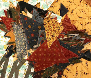 I opted for an on point setting. Actually, Joy came up with the idea, but didn't know what to do with her straight set applique blocks. We collaborated on this design to highlight all the blocks. I really like the pieced blocks on point with setting squares between them. It adds a color plan so I won't have to remake blocks for a more scrappy overall look. I think Jan's blocks will shine set apart in the gold border. Love 'em. I'll need to make a few extra pieced blocks - 2 for the center and 4 for the corners. I chose to use 6 different fabrics for each color of the setting squares - 6 blacks, 6 greens, 6 golds, 6 purples and 6 navys, along with 6 reds for the setting triangles. I'll have plenty of leftovers to make the scrappy border. The quilt finishes 112" square - a really great size for king or queen beds. I can't wait to sleep under my Blockheads quilt, dreaming of quilters and 6" blocks. Is that weird???